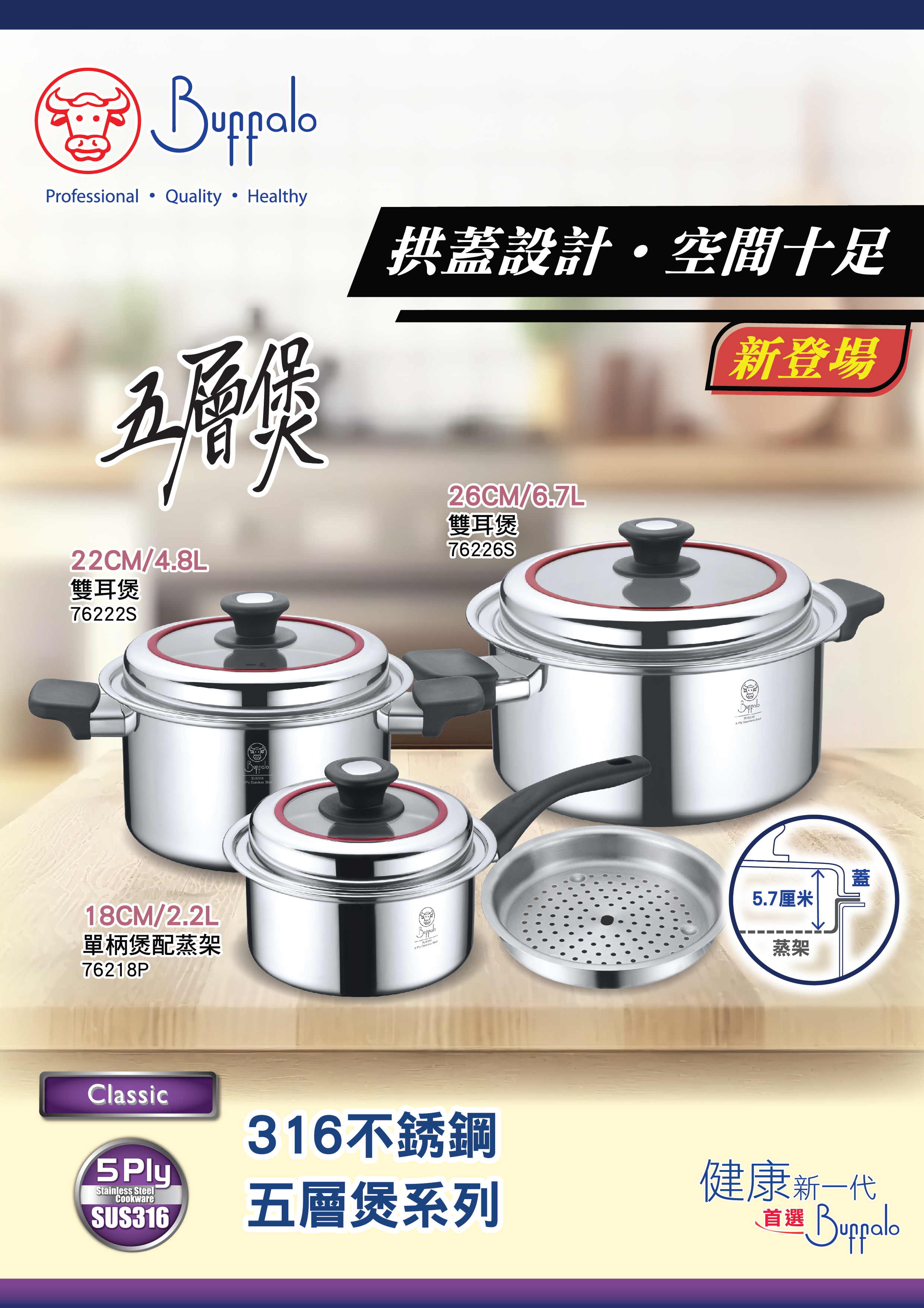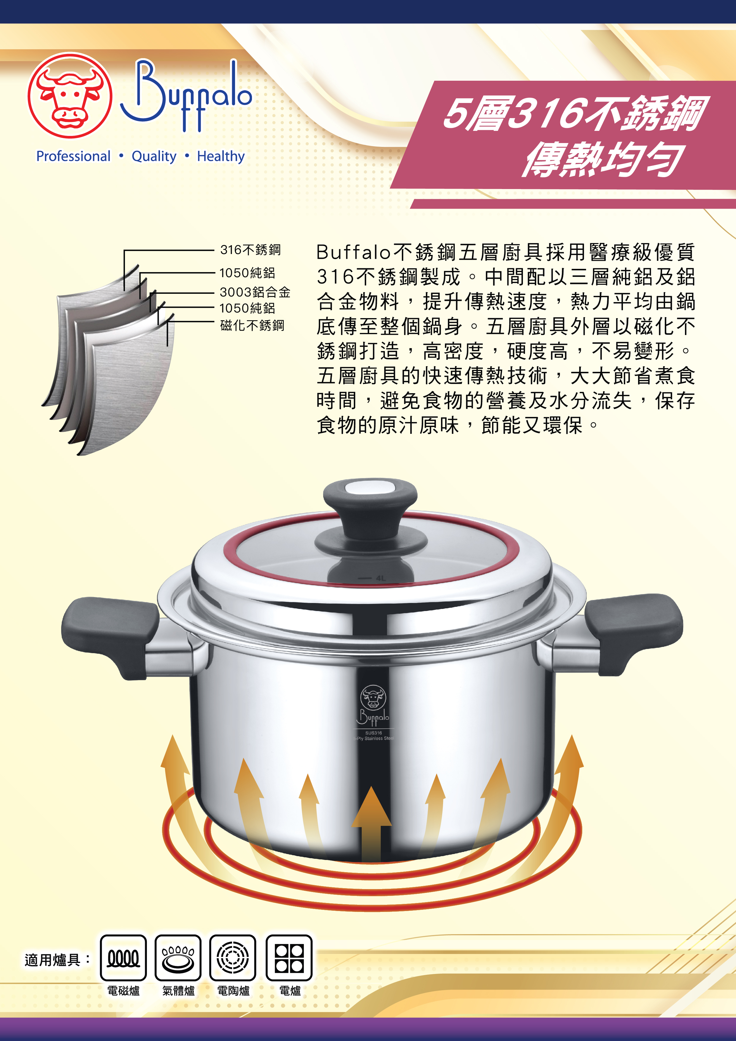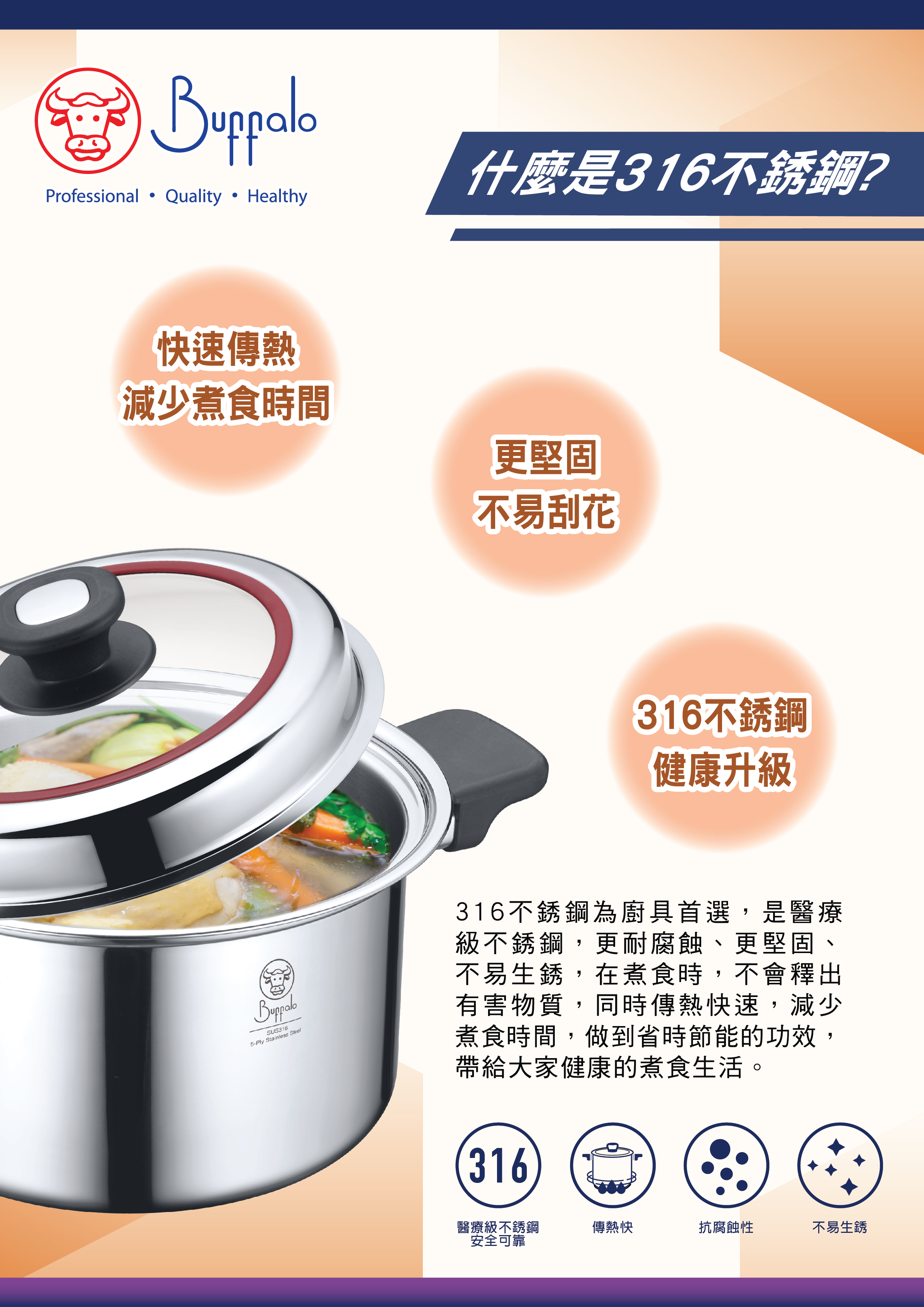 SUS316為優質醫療級不銹鋼,可安全用於生物醫學應用、身體穿孔和植入人體。它還可以用於食品和藥品的生產和處理。此外,316不銹鋼含鉬元素,使其更耐腐蝕性。它可抵抗鹽對廚具材質表面所造成的影響。此外,它不會與煮熟後的食物、蔬菜和食品添加劑中的酸鹼值產生變化,使烹煮的食物更安全及健康。牛頭牌廚具外層儲熱效能高,傳熱快速,省時節能;外層亦不易被氧化或銹蝕。316不銹鋼傳熱快,可以縮短烹飪時間,並保留了更多食物的水分和營養