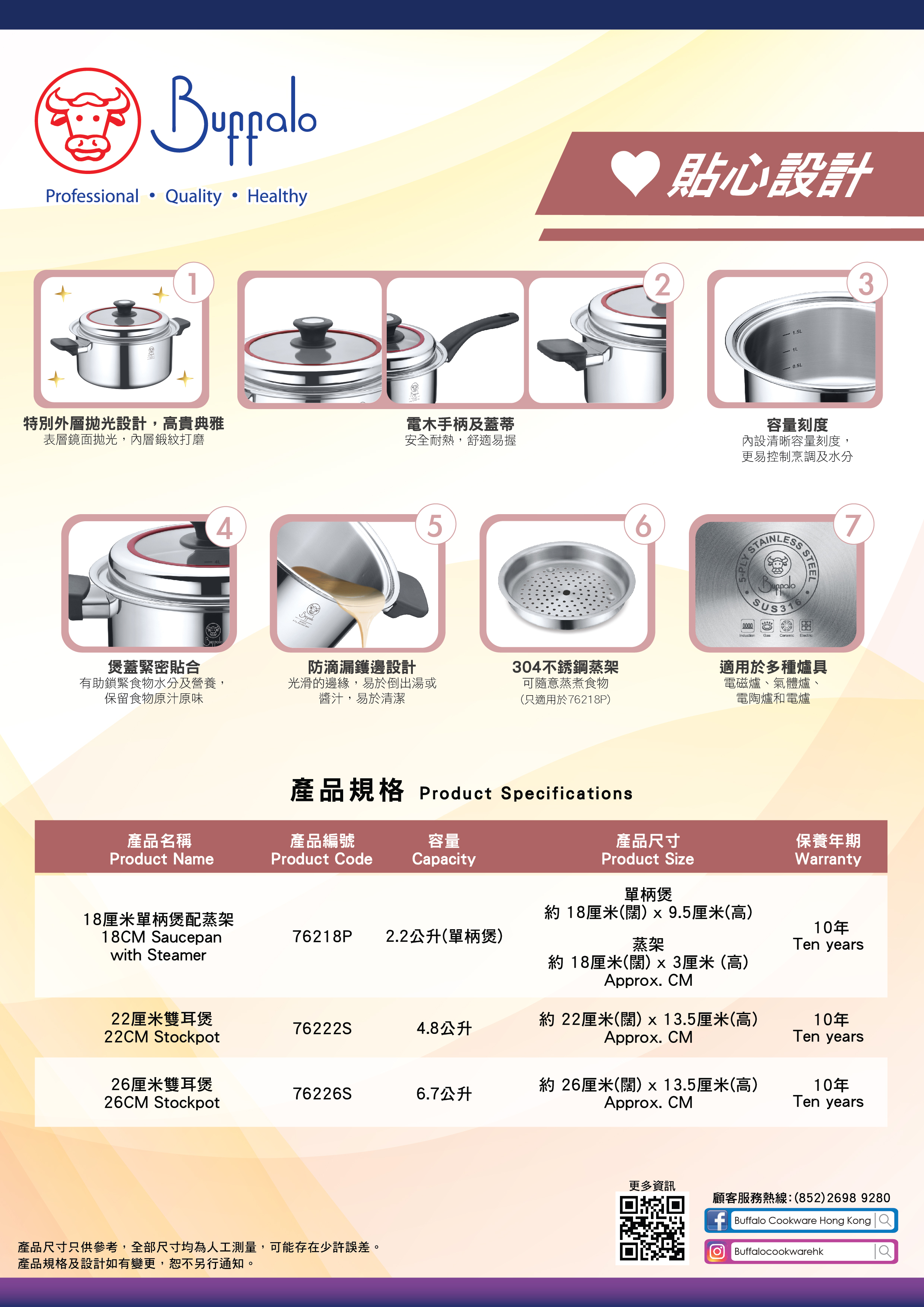 - 單柄煲:18cm(⌀) x 9.5cm(H)